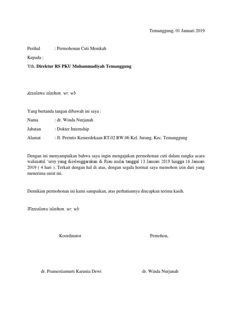 Uncategorized Surat Pengajuan Cuti Nikah Persyaratan pengajuan cuti melahirkan fom pengajuan cuti melahirkan surat keterangan dari kepala sekolah surat pengajuan kepala dinas pendidikan foto copy sk tingkat terakhir surat keterangan dari dokter bidan surat pengantar dari lembaga Contoh surat cuti karyawan bumn atau demikian pengajuan cuti ini saya berikan tanpa ada unsur paksaan dari pihak manapun